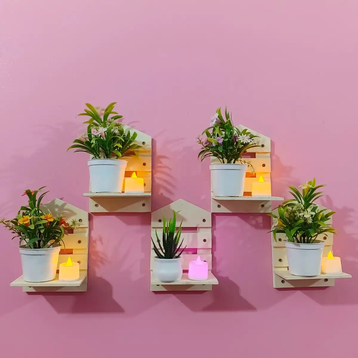 🌿 প্রতিটি শেলফের সাথে রয়েছে সুন্দর কৃত্রিম ফুল বা গাছের টব ও নরম আলোয় জ্বলজ্বলে pink, yellow and warm কালারের LED ক্যান্ডেল, যা আপনার রুমে এনে দেবে শান্ত ও আরামদায়ক পরিবেশ।